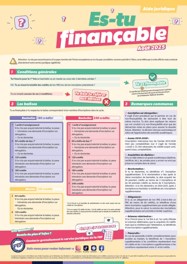 La FEF met à disposition des étudiant·e·s de la Fédération Wallonie-Bruxelles et de ses Conseils étudiants une série de fiches info “AIDE JURIDIQUE” abordant différentes thématiques telles que l’admission aux études, les droits des étudiant.e.s au CPAS, les allocations d’études supérieures, …